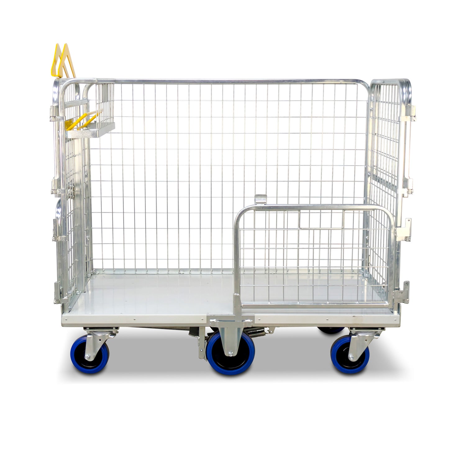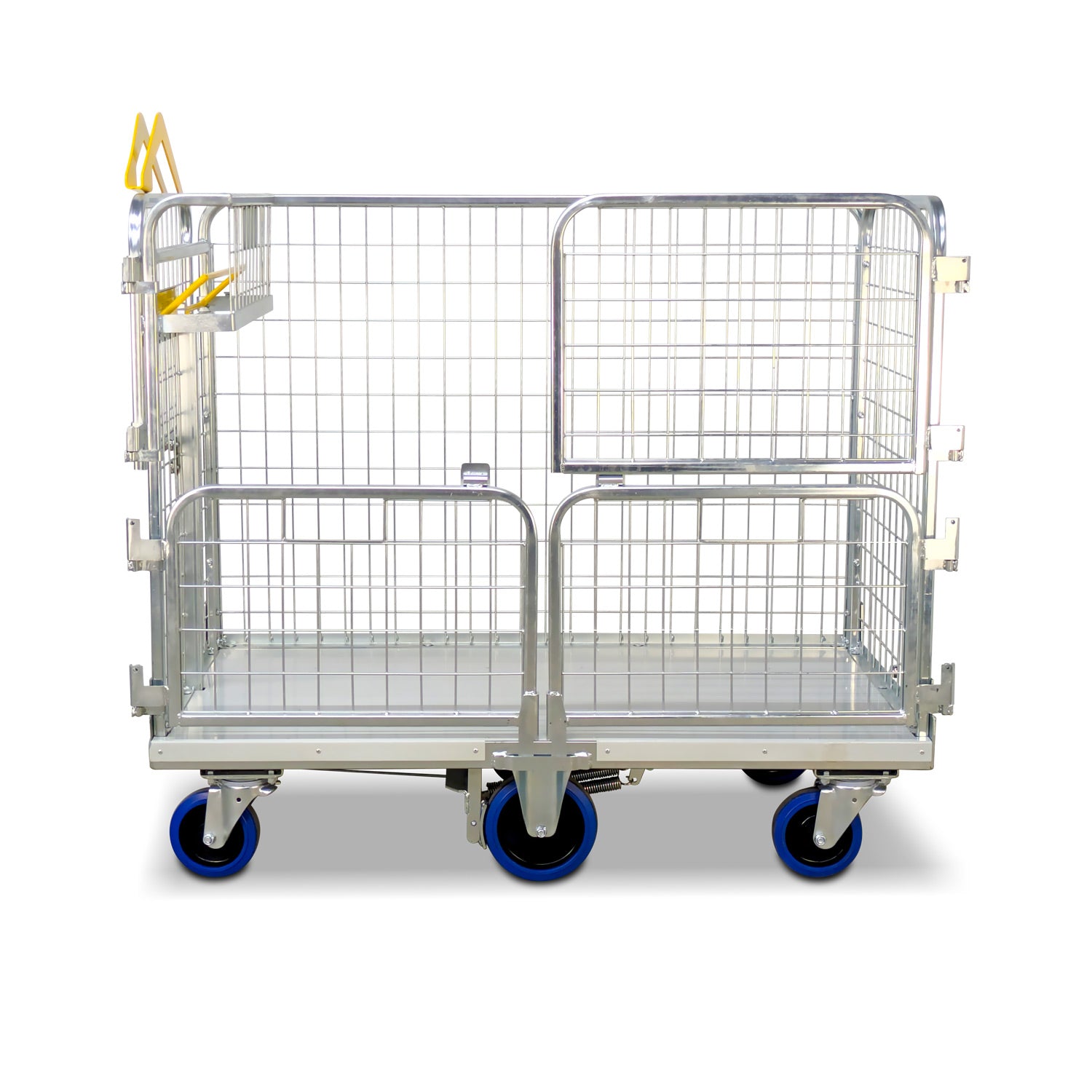 Engineered for parcel management, storage, and distribution, this 6-wheel mesh cage trolley delivers superior safety, access, and manoeuvrability in busy warehouse and parcel processing environments. Its unique four-door configuration allows operators to access the top half of the cage without risking smaller items falling from the bottom section. Each door folds back a full 270 degrees and is magnetically latched when open, ensuring they stay completely out of the way during loading and unloading.