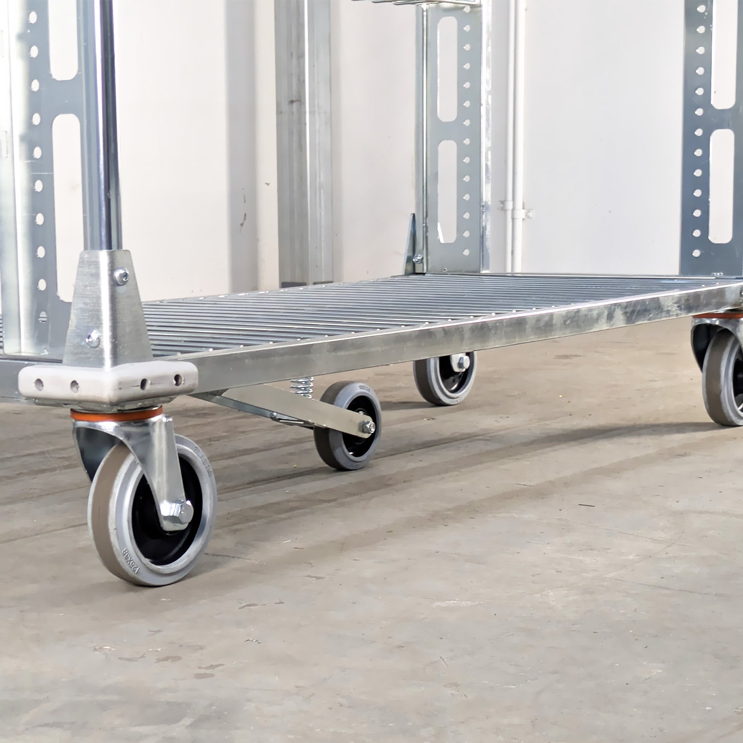 The central pivot wheel dramatically improves turning manoeuvrability, allowing users to navigate narrow spaces, packing stations, and doorways with ease. It also increases stability on gentle slopes and uneven surfaces, reducing the risk of tipping and improving handling. By minimising twisting and pushing strain, it supports safer movement and protects the operator’s back.